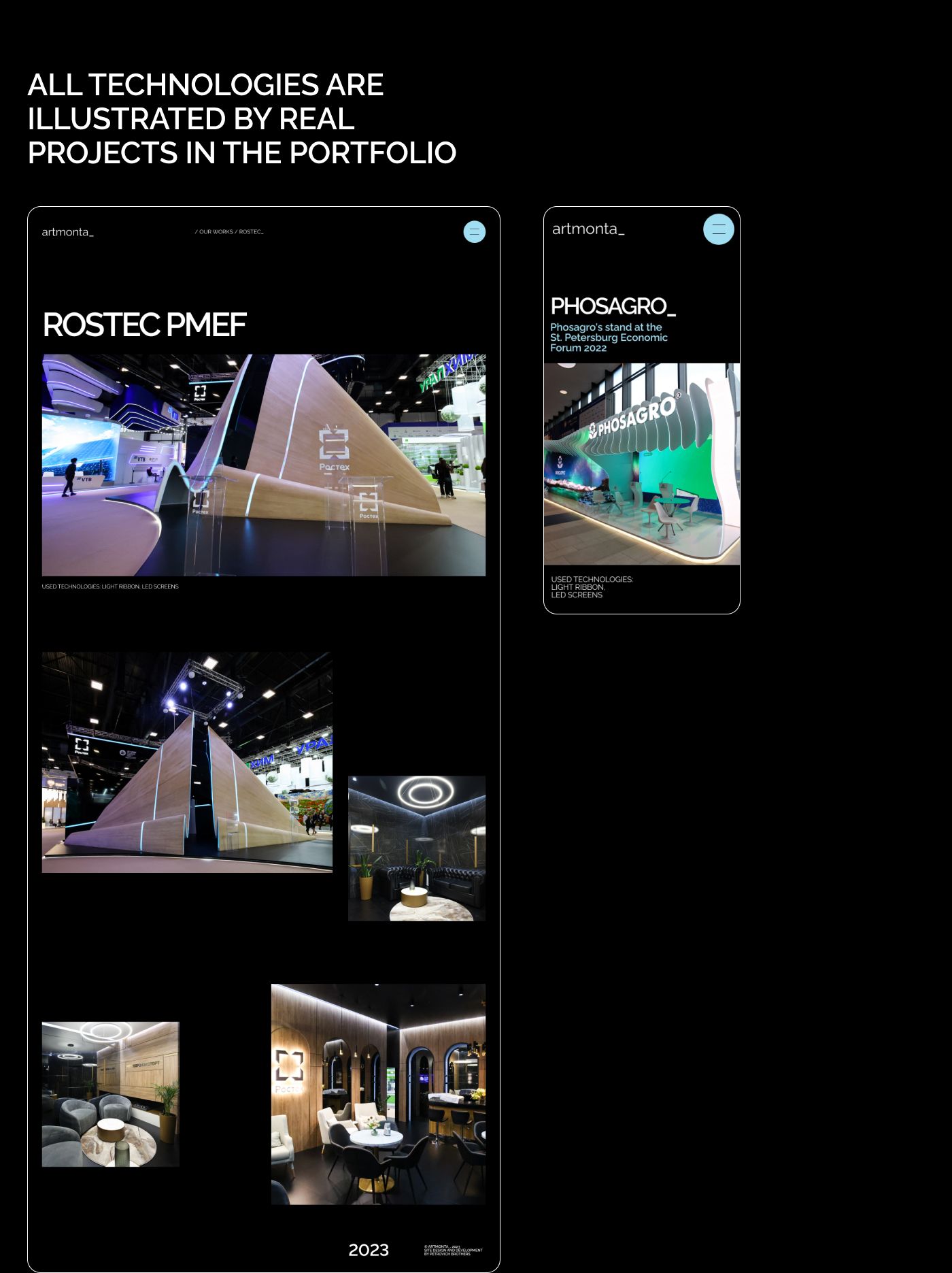 «Артмонта» — это компания, которая строит выставочные стенды больше 30 лет. За это время выполнено более 800 проектов, основная часть в России, но были и международные проекты в ОАЭ и в Китае. У компании большая собственная производственная база и более 100 штатных сотрудников. Мы сделали сайт для компании. На главной странице показали технологии, которые используются при застройке стендов, в виде футуристической 3D-анимации. По каждой технологии можно посмотреть примеры проектов в портфолио.