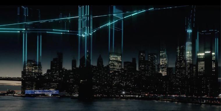 Чтобы не строить в 3D весь Манхеттен, мы взяли съемку с дрона и наложили сверху анимацию. Виртуальный город взят из Google Maps, оказалось что на некоторые города у гугла есть достаточно подробная 3D карта домов. Да, они там в виде прямоугольников, но нам было этого достаточно. Было сложно совместить реальный город с виртуальным, получалось или точно или красиво. Остановились, конечно же, на красивом варианте, и часть виртуальных домов пришлось убрать или переместить.